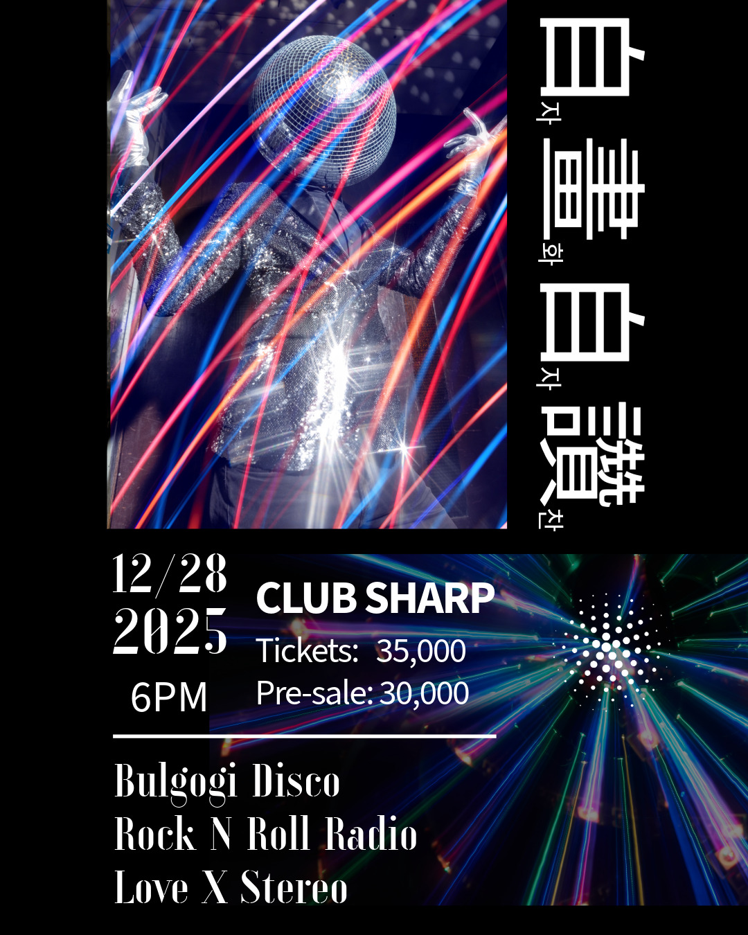[2025.12.28 (SUN) 18:00 공연 안내]🎊 자화자찬 自畫自讚 🎊 2025년의 마지막 페이지를 덮으며, 숨 가쁘게 달려온 자기 자신에게 따뜻한 격려를 건넬 시간입니다. 올 한 해 동안 크고 작은 어려움 속에서도 포기하지 않고 꿋꿋이 나아온 당신의 노력에 진심으로 박수를 보냅니다.🎉 불고기디스코 (Bulgogi Disco) @bulgogidisco🎉 로큰롤라디오 (Rock N Roll Radio) @rocknrollradio_official🎉 러브엑스테레오 (Love X Stereo) @lovexstereo📌 Location 클럽 샤프 @club_sharp📌 Ticket • 현매 ₩35,000원 • 예매 ₩30,000원 - 예매는 12월 27일(토) 자정까지 가능합니다(현매 있음). 예매 프로필 링크의 구글 폼 작성 (https://forms.gle/wfdW5ZkBfvVqTrSj7) Reservations on [LinkInBio] - 문의는 @lovexstereo 혹은 010-7118-3076로 해주시면 됩니다.📌...